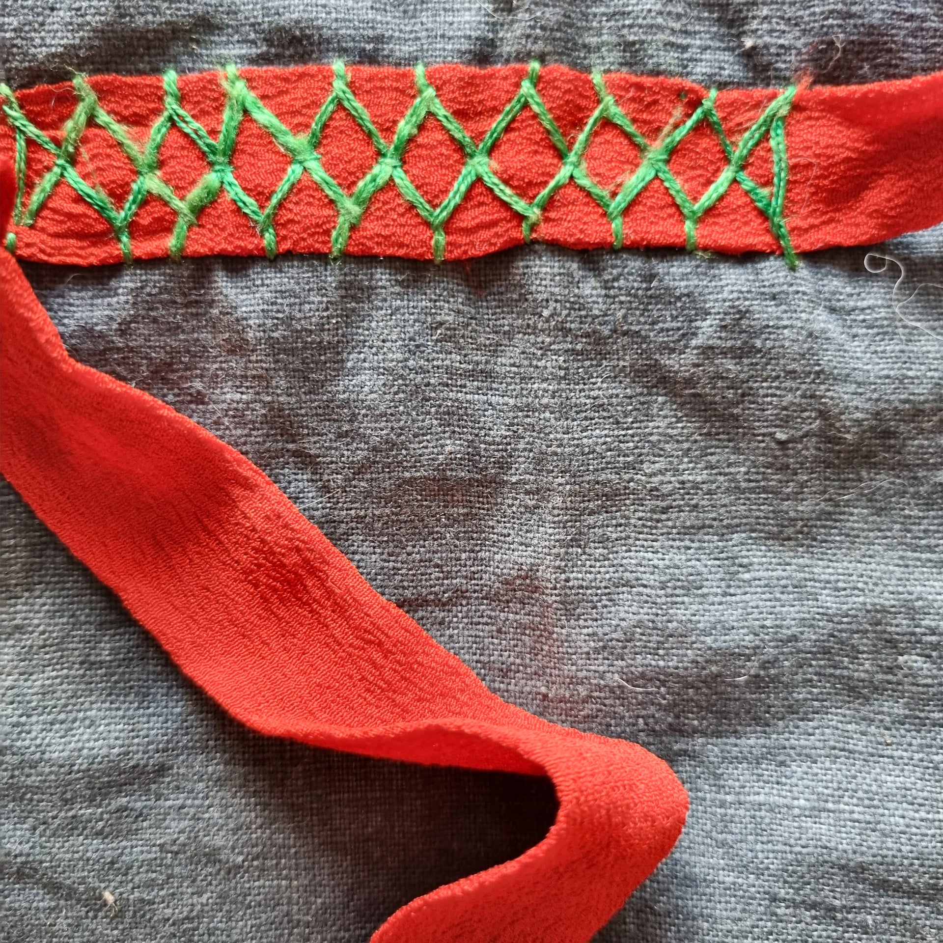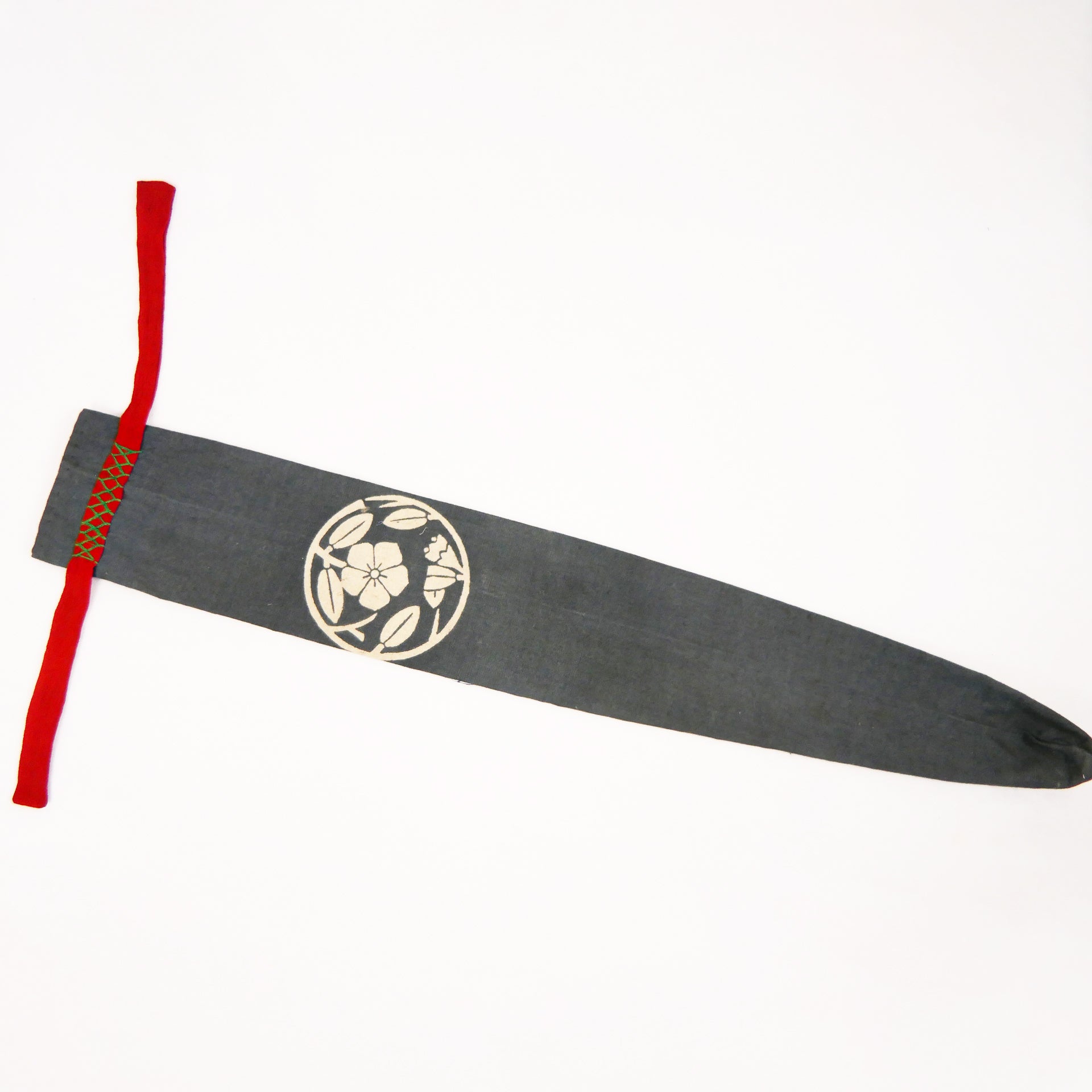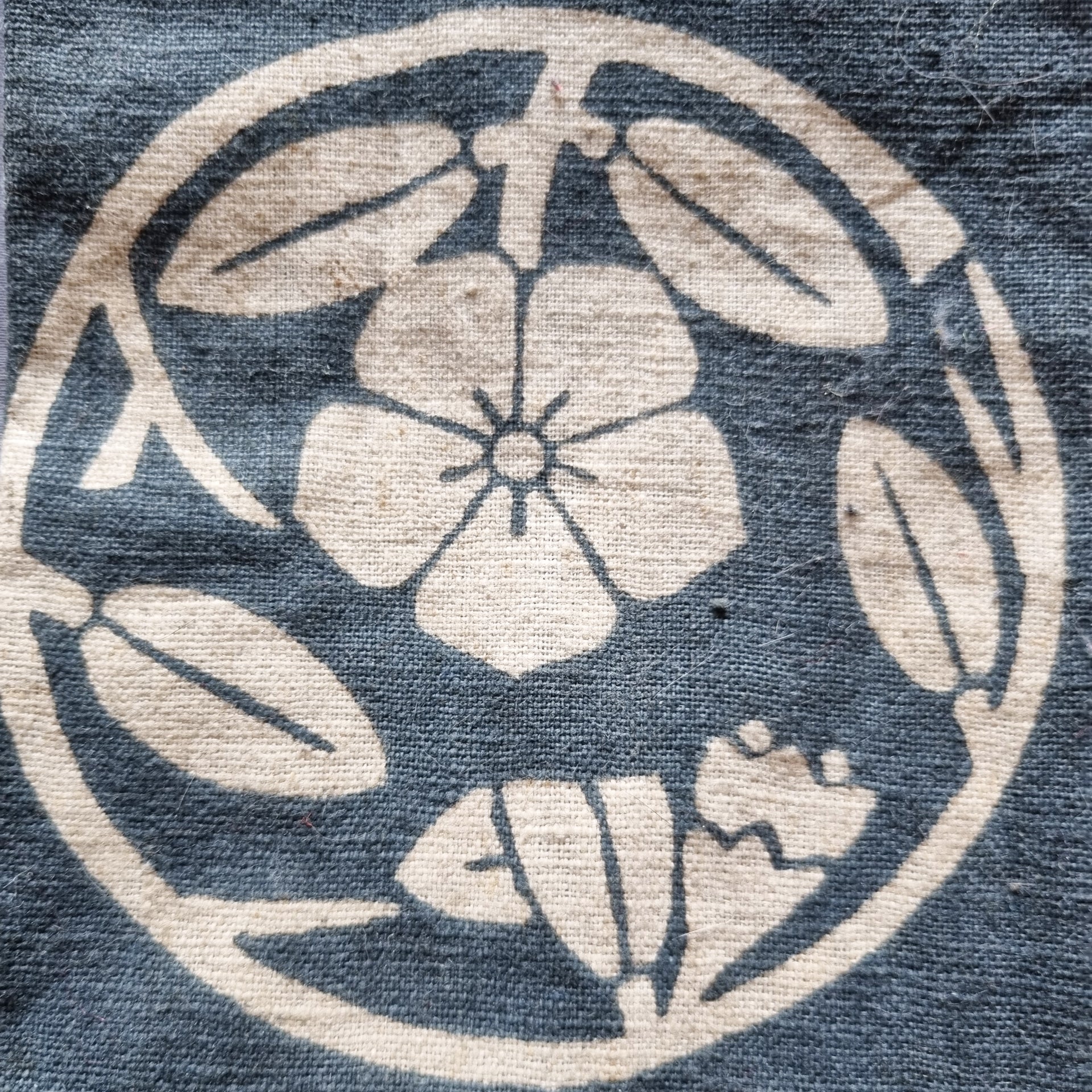 A really lovely item, a vintage Japanese indigo dyed saw sheath with a rice resist kamon motif and stitched on silk ribbon closure.