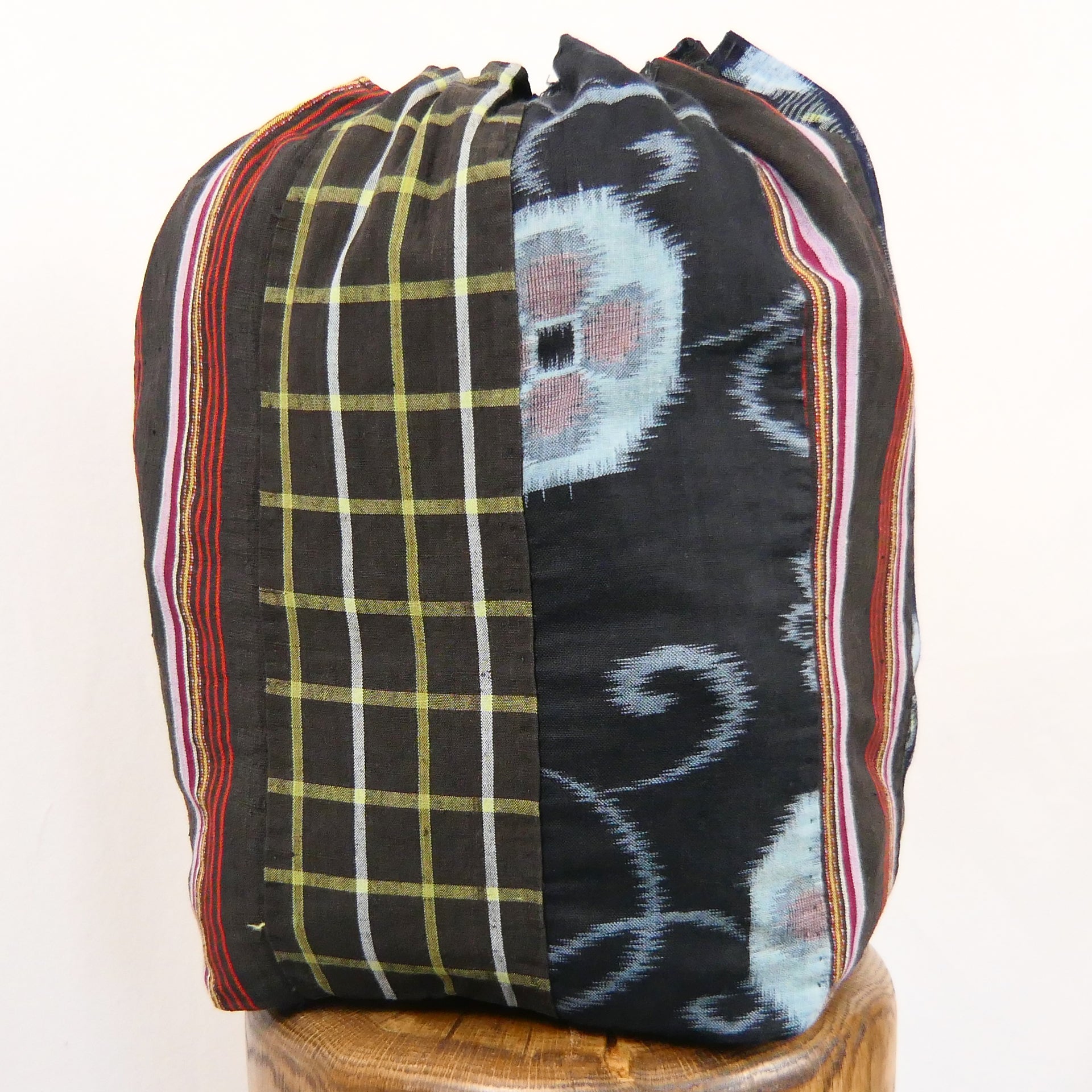 Large sized komebukuro bag with patchwork of different fabric and fully lined.